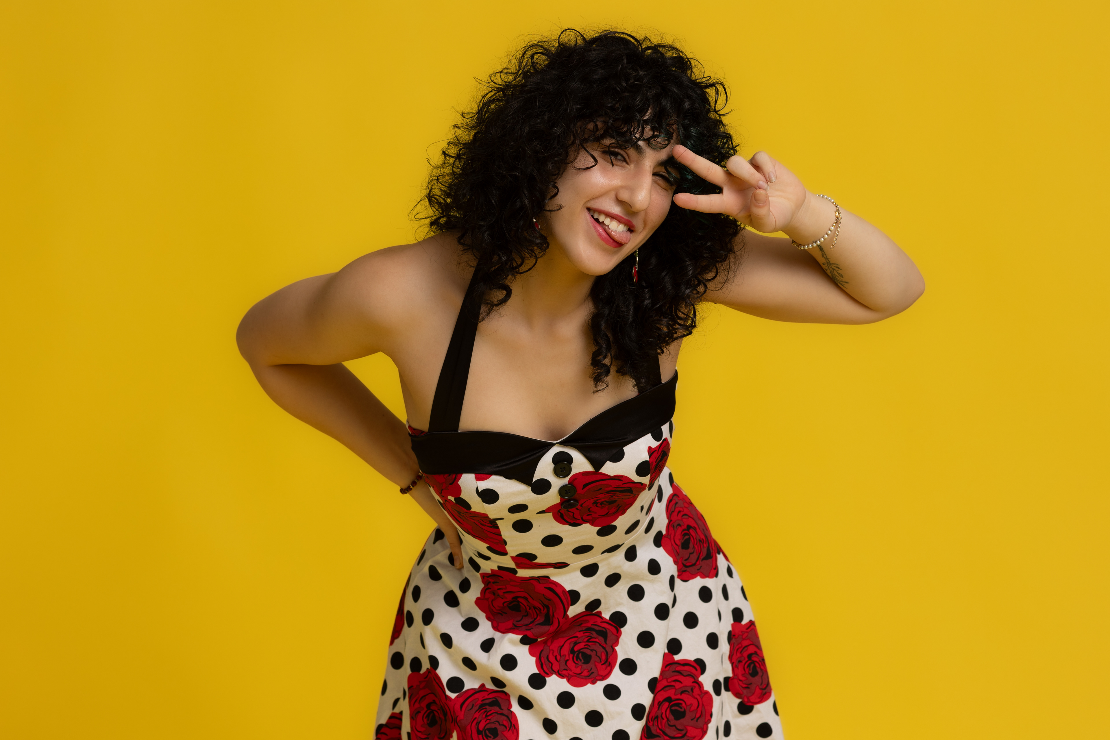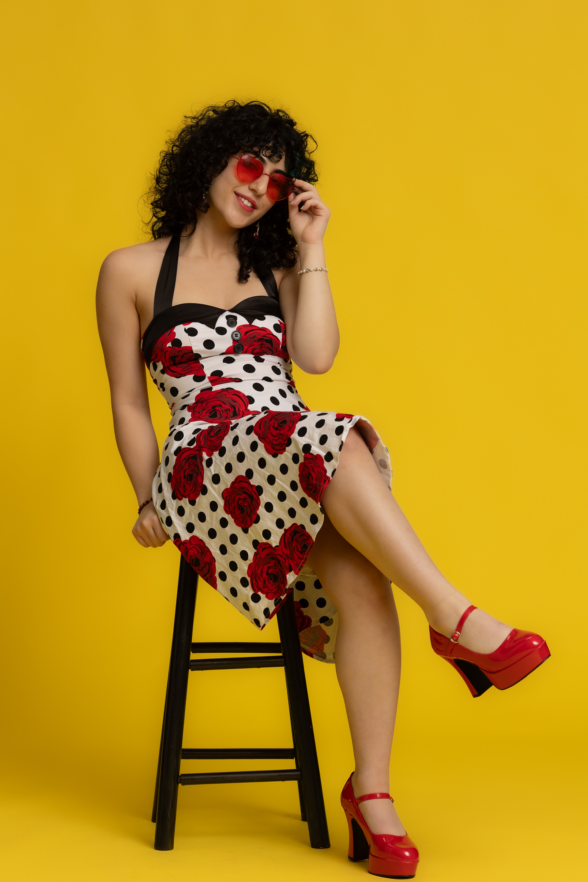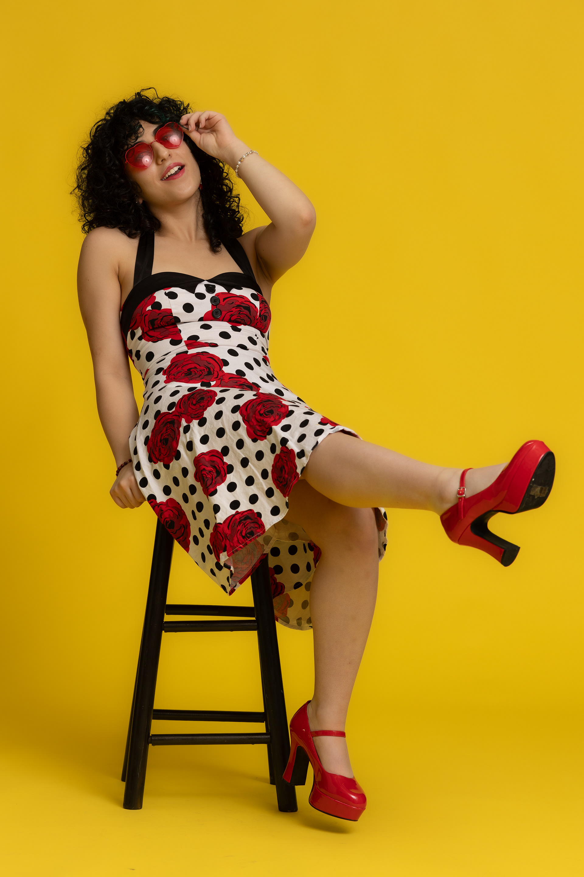 This was the first shoot that I did with the incredibly talented Sara Shamoon. This idea was inspired by the vintage 1950's pinup look. Sara's naturally curly hair really added to the look. She was able to pull out this red dress which popped against the bright yellow backdrop I selected. We were in luck, Sara's boss loaned her a set of bright red Mary Jane's. Join me as I walk through the pictures from this incredible set. I'd never really shot a classic vintage theme before. I was excited to try a 50s pin up theme. As an illustrator in self-training, I was a big fan of the vintage 50s pulp comic look.